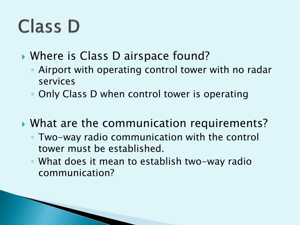 Oct 20, 2020 · class d airspace is most often found starting at the surface and extending up to and including 2,500 feet within a radius of 5 statute miles from the primary airport.